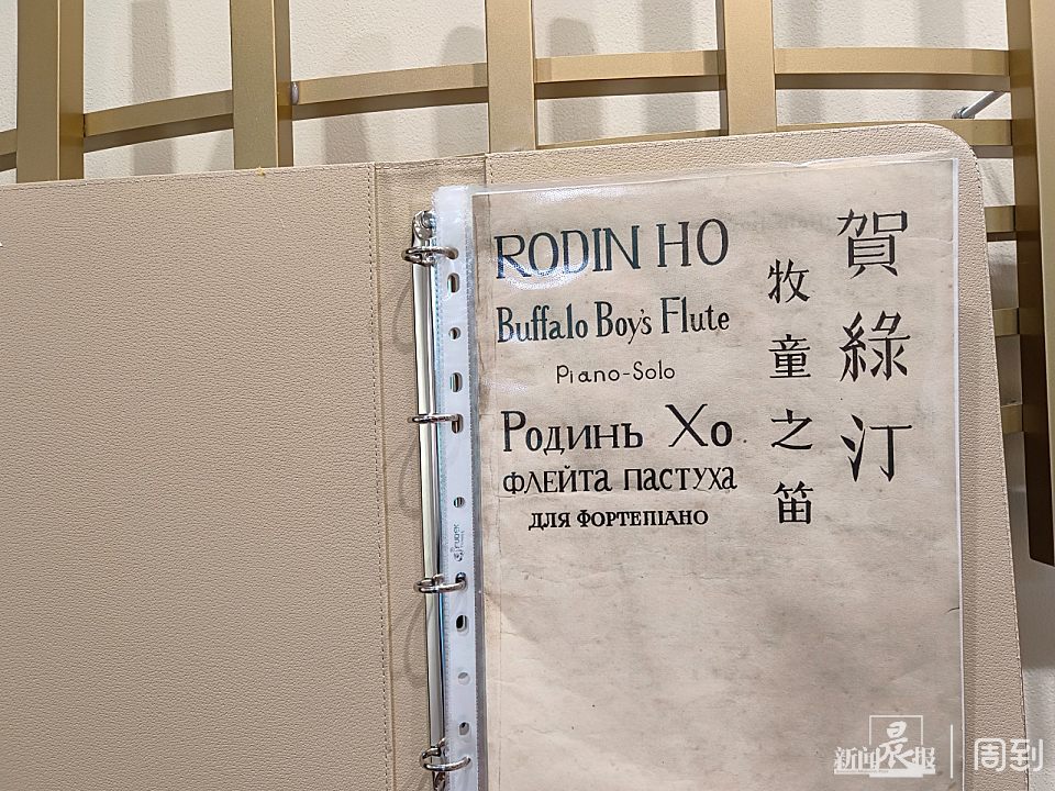 踏入这座小楼的客人们随着蜿蜒的五线谱,听着一段段声音资料,读着一个个创作故事,仿佛自己也站到了贺老身旁,和他一同经历那段难忘岁月。展厅的第一件展品是1935年出版《牧童之笛》乐谱,《牧童之笛》是贺绿汀扬名乐坛的起点,也是中国人创作的钢琴曲走向世界的开始。这套《牧童之笛》(后被称为《牧童短笛》)的钢琴谱首版于1935年,封面上分别使用了英语、俄语和中文三种语言标识。
