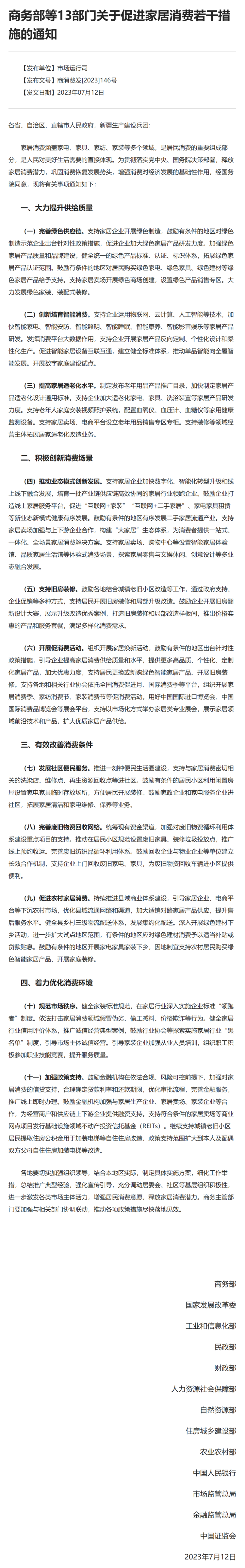 据商务部网站消息,商务部等13部门印发关于促进家居消费若干措施的通知。