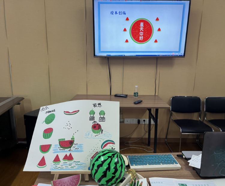 为了更好地让小朋友们沉浸在绘本世界,梁洁老师组织大家进行了暖场游戏——大小西瓜,嘴巴上说“大西瓜”的同时手上要比“小西瓜”的动作,相反,嘴上说“小西瓜”的同时手上要比“大西瓜”的动作,大家彼此熟悉起来,后面又玩“击鼓传西瓜”的游戏,大家传递西瓜道具,鼓声停下道具在谁手里就要进行自我介绍,小朋友们很快就打成一片。接着又继续完成带有“西瓜”词组的扩充游戏,大家都有非常丰富的想象力,“西瓜冰粉”、“西瓜炒酸奶”、“西瓜糖果”每个词组串联起来构成甜蜜美好的夏日。