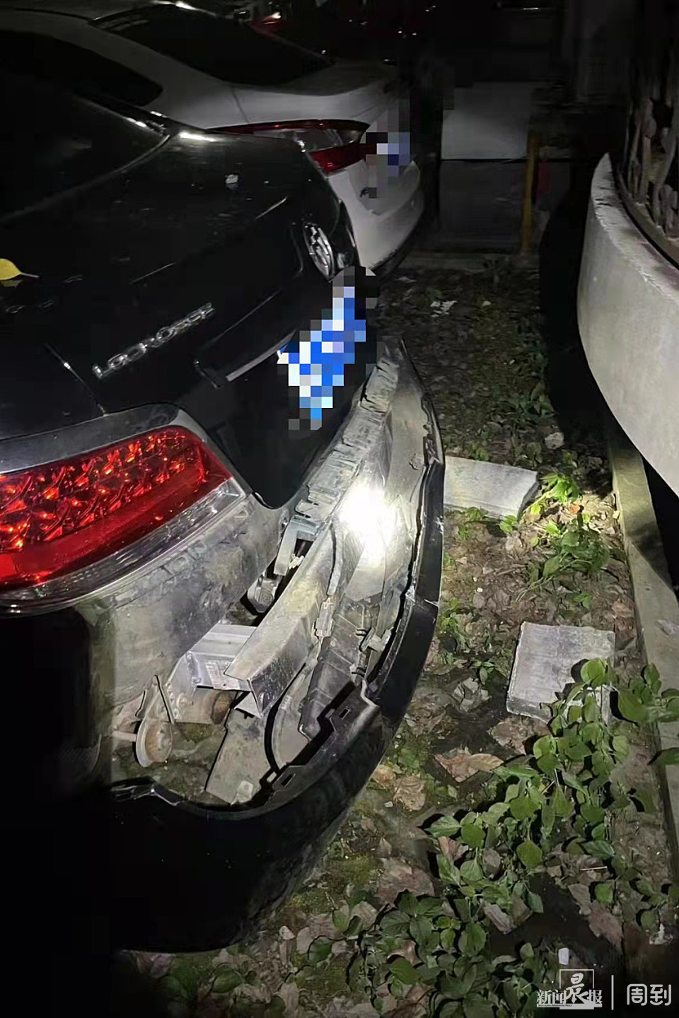 ▲王女士家爱车的保险杠被掉落的外墙水泥块砸坏