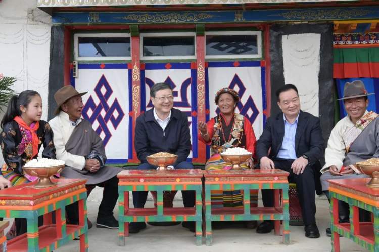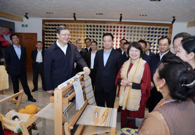 沿着年楚河谷,陈吉宁一行来到江孜县年堆乡索盖村。一条新修的硬化路连接起索盖村105户人家,万亩青稞拔节抽穗,大片油菜花盛开,一幅美丽乡村画卷徐徐展开。代表团一行沿途察看村貌,听取村史和乡村振兴示范村建设情况介绍。村干部告诉沪藏两地领导,在上海援助下,村里坚持党建引领、产业支撑、民生赋能,开展人居环境整治,引入了合作企业,村民人均收入和村集体经济收入持续增长。在上海工匠氆氇工作室,三名藏族妇女正在学习编织更具创意设计的氆氇。陈吉宁详细了解当地特色产品研发和手工业合作社运作情况。他说,改善民生、凝聚人心,是我们做好对口支援工作的出发点和落脚点。要围绕巩固拓展脱贫攻坚成果和乡村振兴有效衔接,立足当地资源和传统文化,围绕特色产业建立标准、提升品质、做强品牌,实现可持续发展。要加大民生投入,着力改善基层生活设施、提高公共服务水平,全面提升农牧民的获得感、幸福感、安全感。