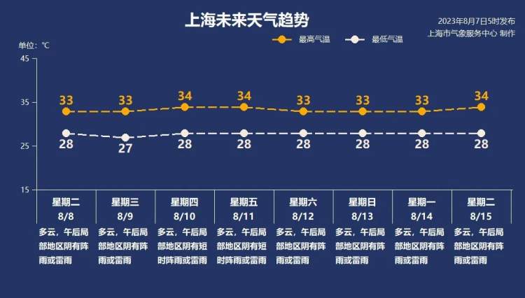 本周周二起申城的天气主打一个“多云+午后雷阵雨”,气温比较稳定,最低在27~28℃,最高在33~34℃。这种天天直逼高温线的气温+午后雷阵雨的组合,有种“下开水”的样子了。体感不会很舒适,做好防暑降温。