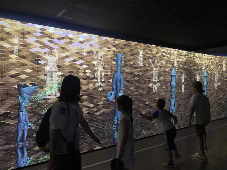 展览还特别设置了体感交互环节,观众通过定点识别后可以生成自己的古蜀人体态镜像,随着身体摆动,对应的古蜀人也随之舞动,仿佛现代人与古蜀人跨越时空的交流。