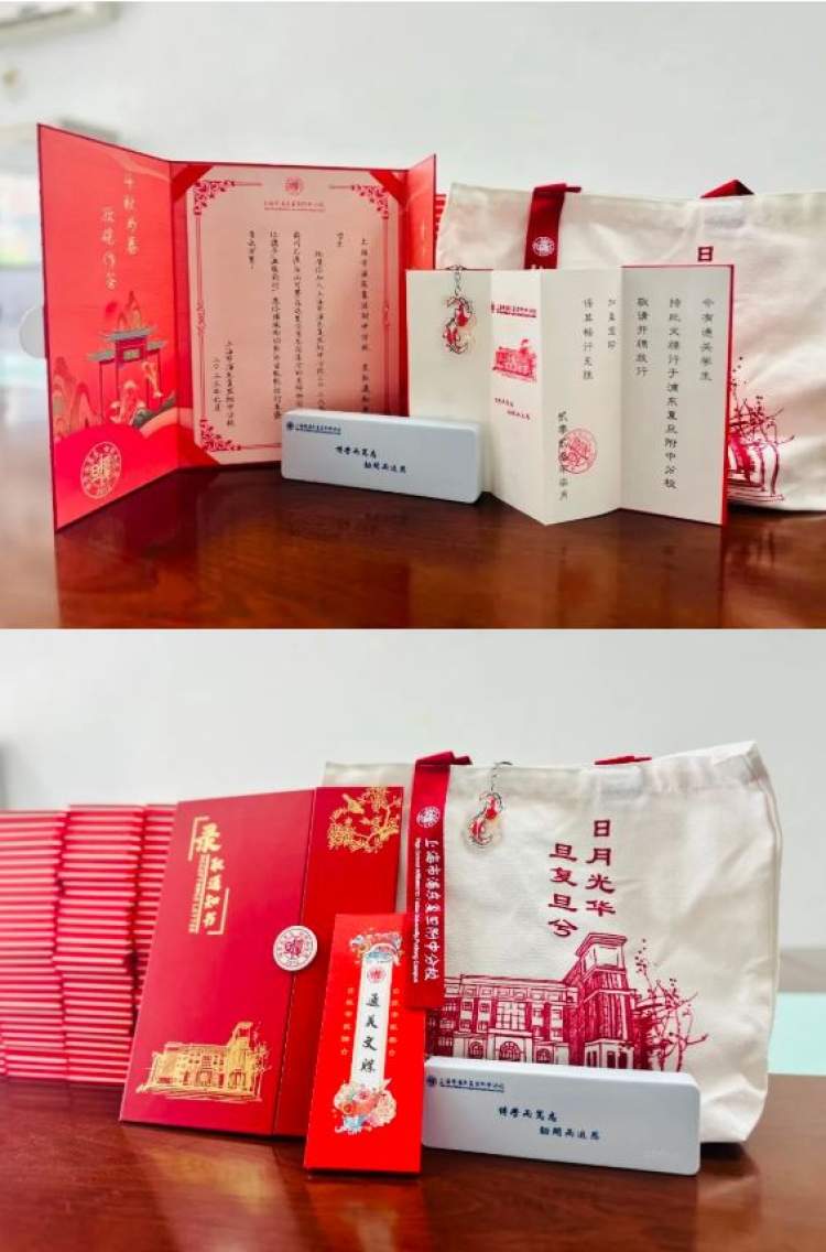 浦东复旦附中分校入学大礼包专为2026届新生设计,主色调是热烈的中国红,共同元素为红色锦鲤。入学纪念品中的锦鲤钥匙扣由学校2022届毕业生徐之涵同学设计;在设计典雅的“通关文牒”中,老师们已经提前为同学们盖好了第一个纪念印章。各种精美的文具与文创,寄托了老师们对同学们的期待,希望各位同学在浦东复旦附中分校学有所成、鱼跃龙门。