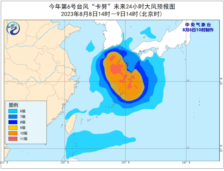 大风预报:8月8日14时至9日14时,巴士海峡、台湾海峡北部、台湾以东洋面、黄海南部部分海域、东海南部和东部及钓鱼岛附近海域将有6-7级、阵风8-9级的大风,其中东海东部部分海域风力可达8-10级,阵风11-12级,“卡努”中心经过的附近海域风力可达11-12级,阵风13-14级。