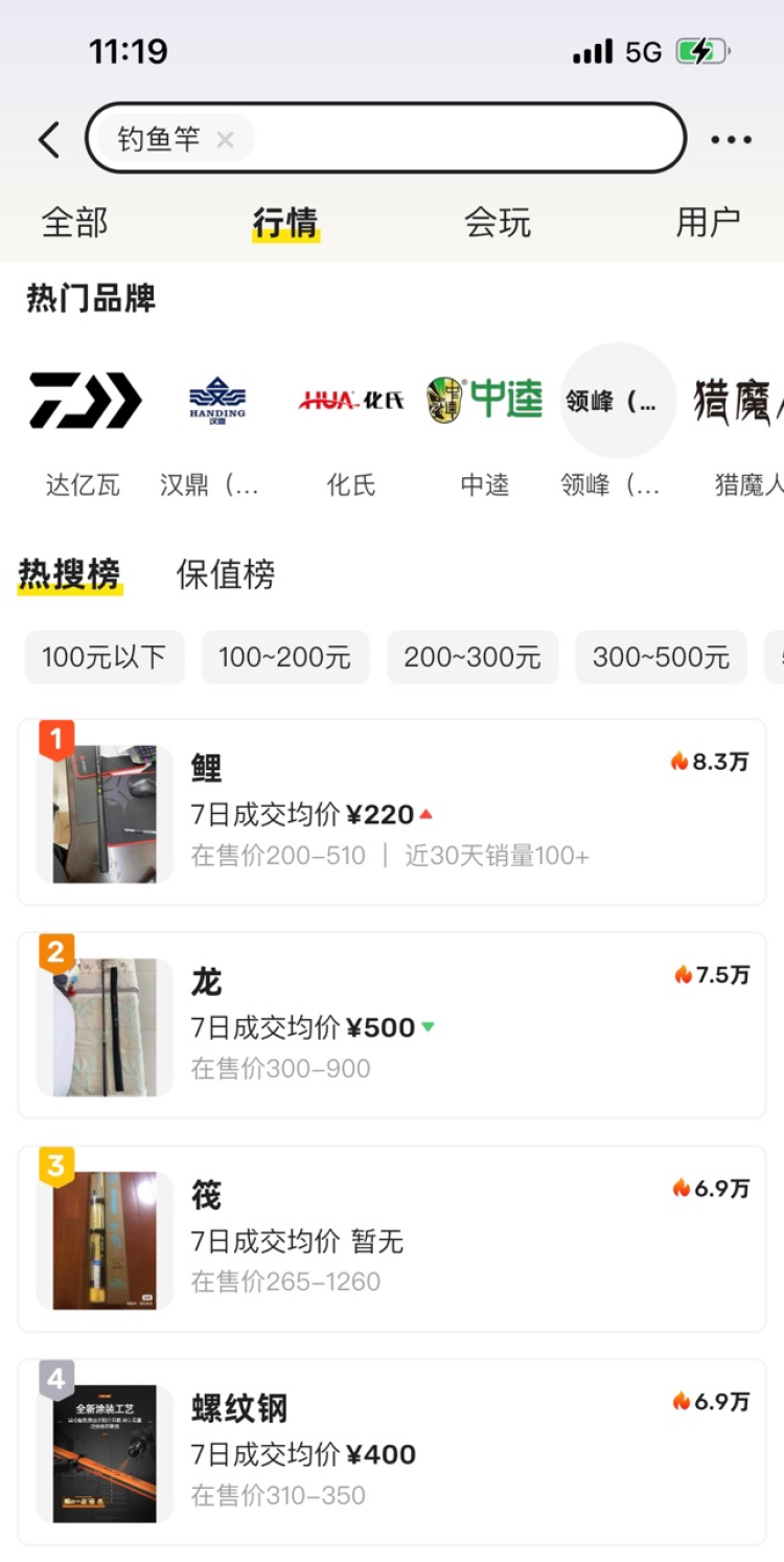 面对逐渐年轻化的“钓鱼佬”大军,闲鱼上也涌现出不少适合学生党、初学者入坑的钓鱼竿,多数价格在百元左右。从闲鱼行情热搜榜上显示,目前热度最高的是中逵的鲤系列钓鱼竿,7日平均成交价在220元左右且呈上涨趋势。