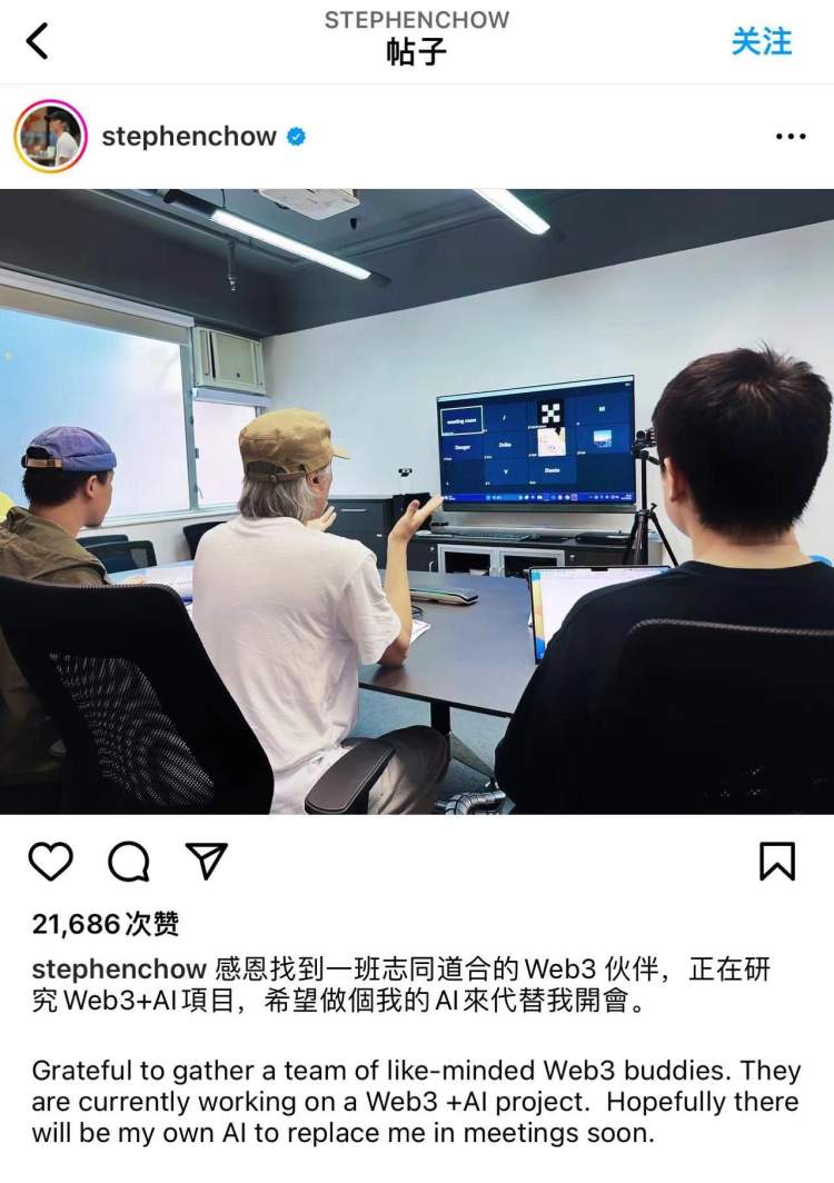 周星驰配文表示,感恩找到一班志同道合的Web3伙伴,正在研究Web3+AI项目,希望能做个他的AI来代替他开会。