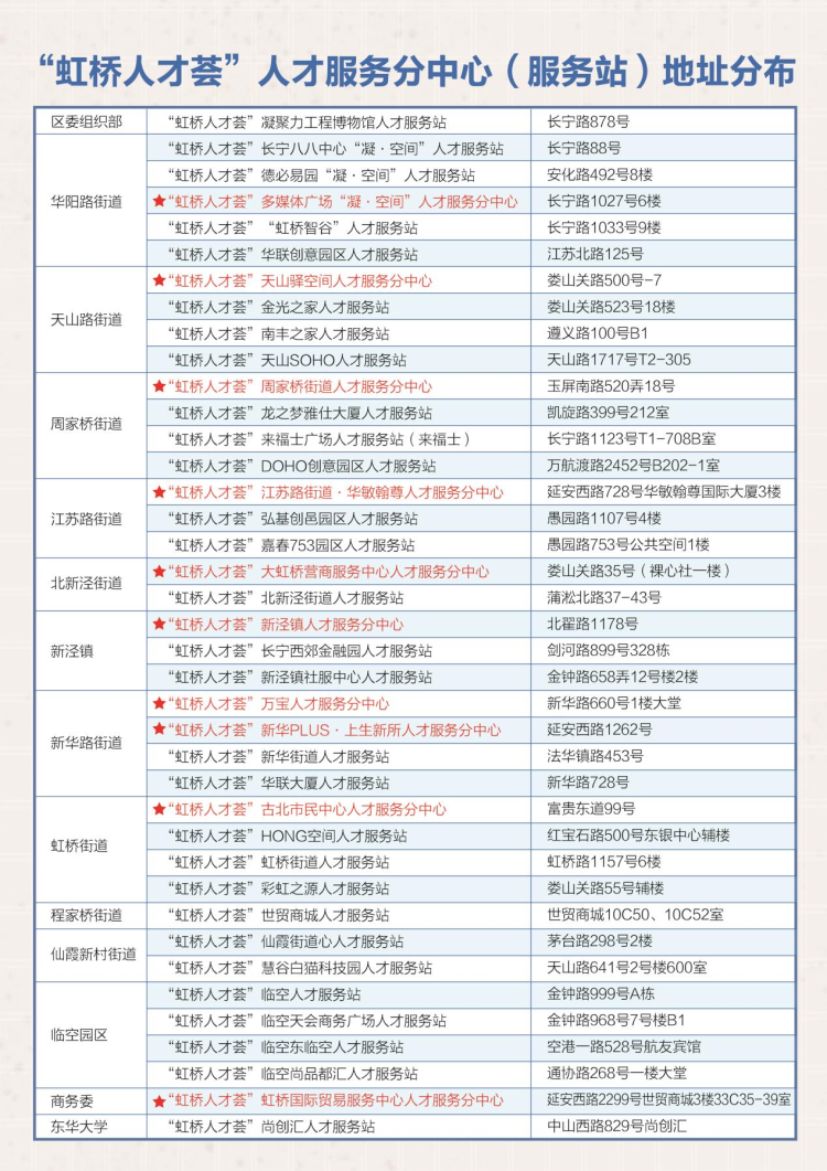 “虹桥人才荟”人才服务分中心(服务站)地址分布: