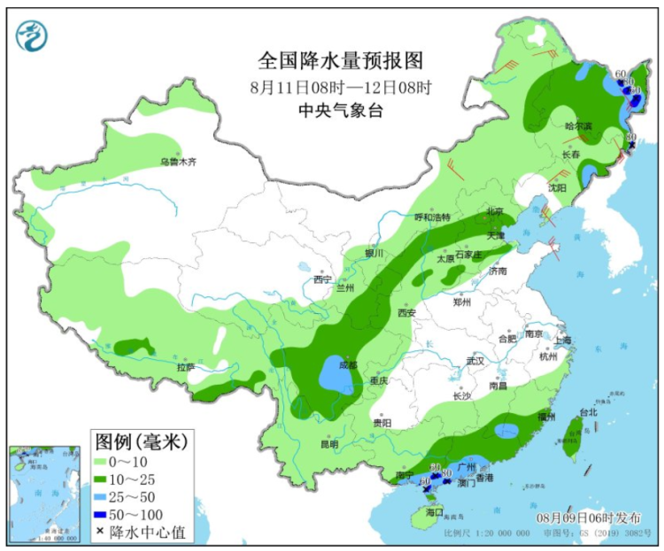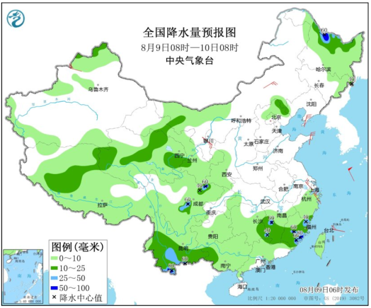 图1 全国降水量预报图(8月9日08时-10日08时)