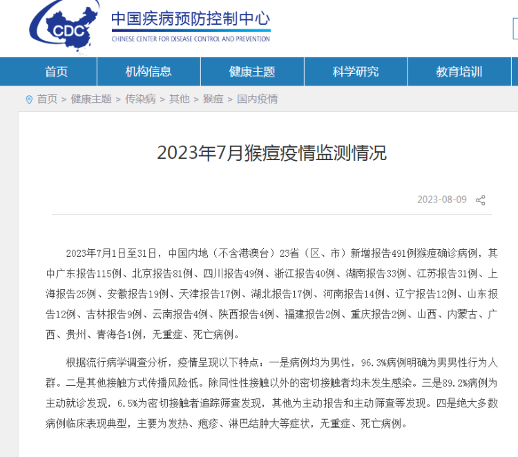 8月9日,据中疾控网站的消息,2023年7月1日至31日,中国内地(不含港澳台)23省(区、市)新增报告491例猴痘确诊病例,其中广东报告115例、北京报告81例、四川报告49例、浙江报告40例、湖南报告33例、江苏报告31例、上海报告25例、安徽报告19例、天津报告17例、湖北报告17例、河南报告14例、辽宁报告12例、山东报告12例、吉林报告9例、云南报告4例、陕西报告4例、福建报告2例、重庆报告2例、山西、内蒙古、广西、贵州、青海各1例,无重症、死亡病例。