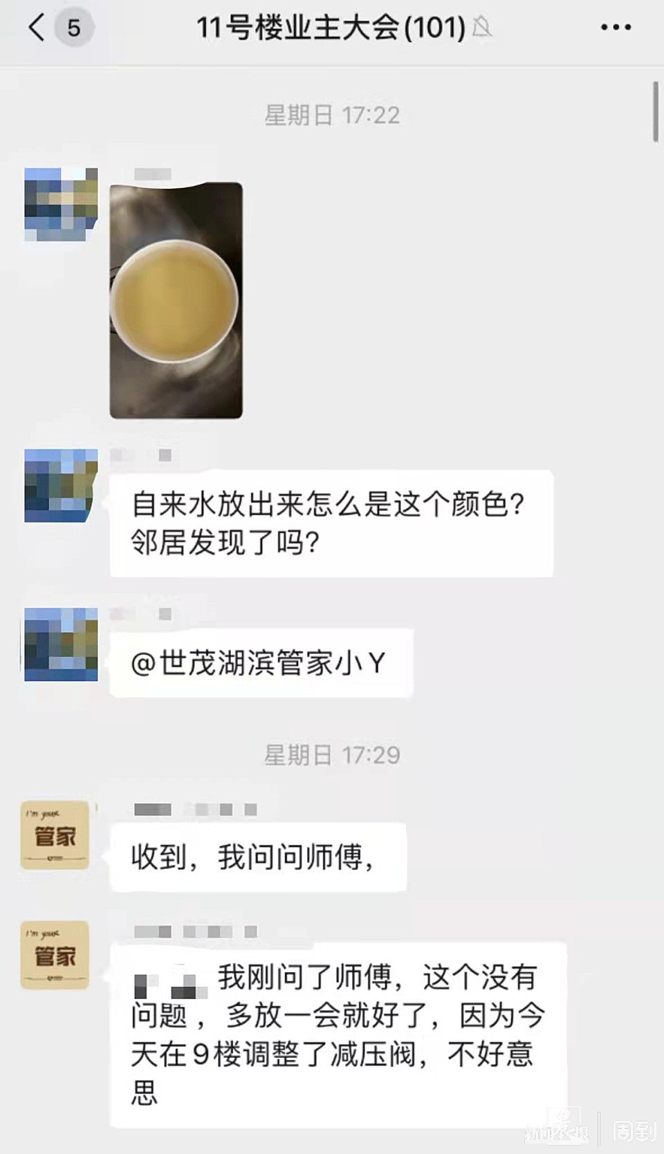 卢女士告诉记者,8月6日傍晚,她看到5楼的邻居在楼栋群里表示,其家中放出了黄色的水,物业管家很快表示:“这个没有问题 ,多放一会就好了,因为今天在9楼调整了减压阀。”
