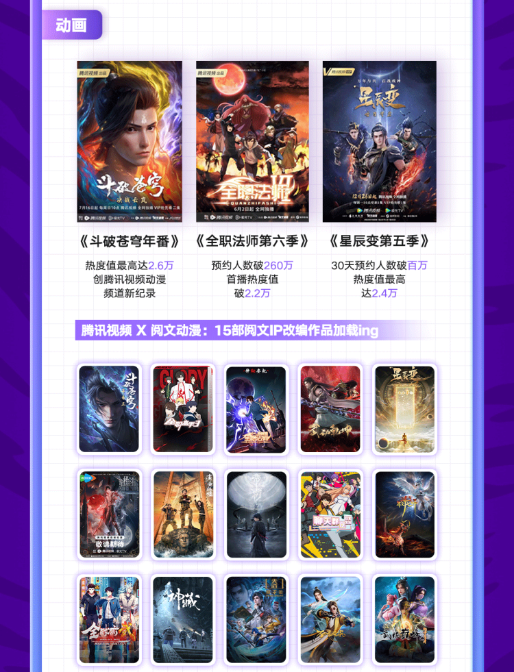 在动画领域,2023年上半年阅文推出了经典IP《星辰变》和《全职法师》的续作,持续收获好评。7月,《斗破苍穹》年番系列的第一季完结,阅文顺势推出了第二季年番,让该IP的热度始终维持在腾讯视频动漫频道的前三名,其热度值最高达到2.6万,并打破了腾讯视频动漫频道热度值纪录。此外,在日前腾讯视频动漫大赏2023年度发布会上,阅文动漫一口气公布了《斗破苍穹年番三》《诡秘之主》《全职高手S3》等15部作品的动画计划,受到粉丝们的热情期待。