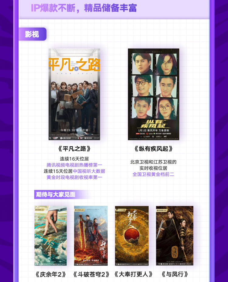 特别是在影视开发方面,今年上半年阅文上线了热播电视剧《平凡之路》和《纵有疾风起》。其中,《平凡之路》播出期间热度居高不下,连续16天位居腾讯视频电视剧热播榜第一,连续15天位居中国视听大数据(CVB)黄金时段电视剧收视率第一,并在多个第三方专业影视数据平台的热度榜单中位列第一;《纵有疾风起》播出期间在北京卫视和江苏卫视的实时收视位居全国卫视黄金档前二。