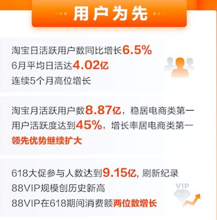 今年618期间,淘宝天猫实现了订单量和客单价的同步增长,参与人数达9.15亿,创历史记录。88Vip用户规模与贡献成交额均取得双位数增长,淘宝作为满足消费者一站式需求唯一平台的优势明显,继续牢牢锁定高购买力用户份额。