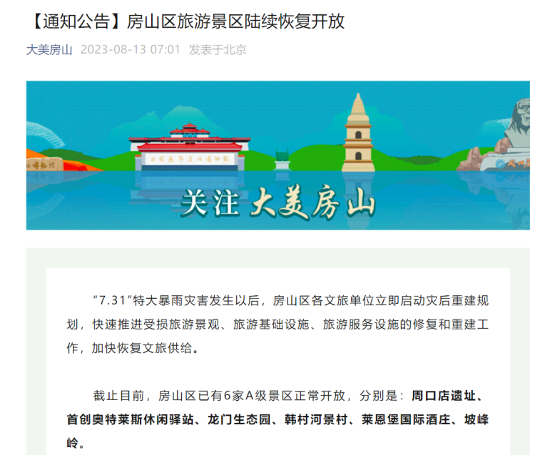 周游天下丨房山区旅游景区陆续恢复,周口店遗址等6家A级景区正常开放 周到君 2023-8-13 来源:周到上海 8月13日,据北京市房山区文化和旅游局微信公众号“大美房山”的消息,“7.31”特大暴雨灾害发生以后,房山区各文旅单位立即启动灾后重建规划,快速推进受损旅游景观、旅游基础设施、旅游服务设施的修复和重建工作,加快恢复文旅供给。 截至目前,房山区已有6家A级景区正常开放,分别是:周口店遗址、首创奥特莱斯休闲驿站、龙门生态园、韩村河景村、莱恩堡国际酒庄、坡峰岭。 云居寺、张坊古战道、青龙湖水上乐园、窦店清真寺预计8月底前开放;石花洞、房山世界地质公园博物馆、仙栖洞、中华石雕艺术园、月亮山预计9月底前开放。具体开园时间请及时关注相关景区微信公众号。 大美房山提醒广大市民及游客,出行前要及时关注临近预警预报信息,合理规划行程,外出注意防雷避雨和交通安全。 来源:周到上海 作者:周到君 赞一个 (0)