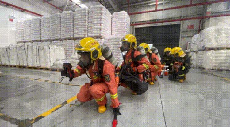 接到报警后,上海化学工业区消防救援支队和奉贤区消防救援支队共调集19辆消防车、100余人参与演练,其中包括举高喷射、灭火冷却、内攻搜救、战勤保障、通信指挥等作战单元,涵盖了高喷车、云梯车、消防灭火机器人、无人机等高精尖装备。