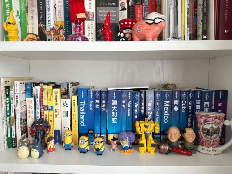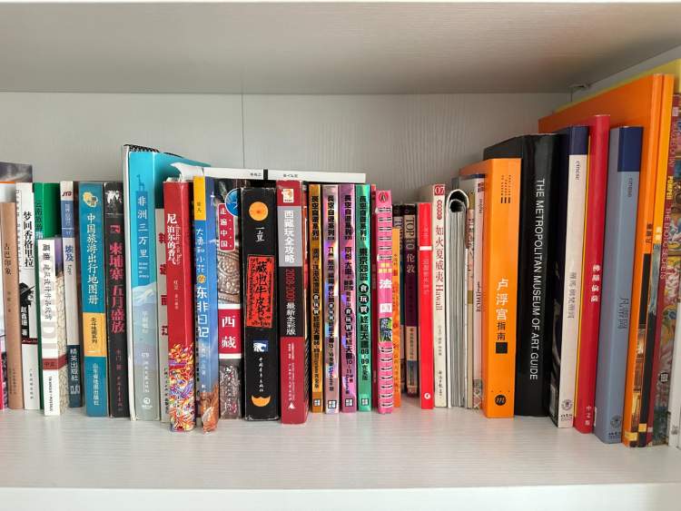 即便是现在的家中,书架上都存有那些堪称时代印记的旅游丛书,丫丫发来一张照片,可以看到书架上一系列的《lonely planet》,有中文版也有英文版,还有《长空自游系列丛书》,以及伦敦、卢浮宫、罗马、埃及等等各个目的地的攻略书。