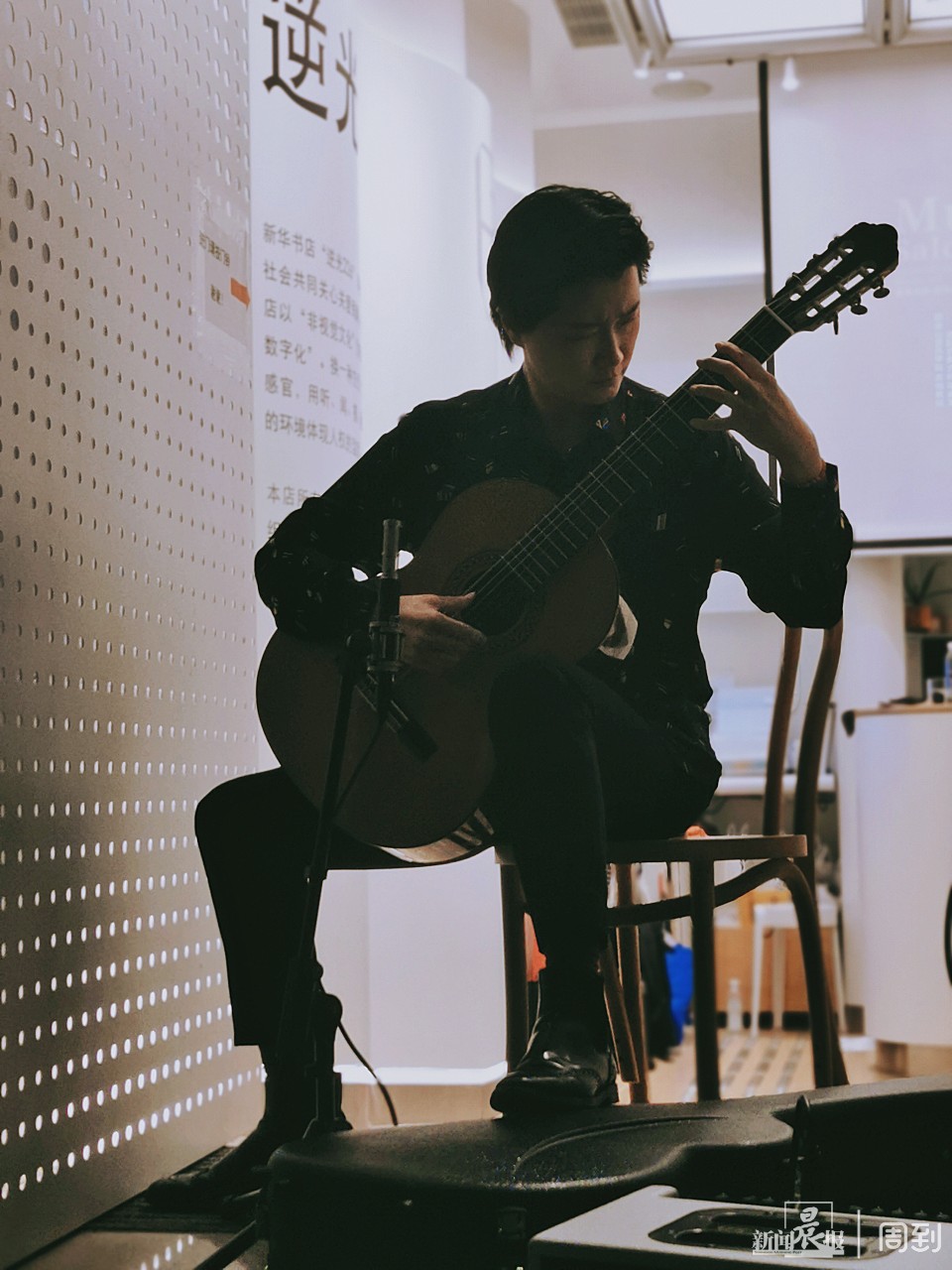 苏萌在逆光226书店门口弹奏吉他