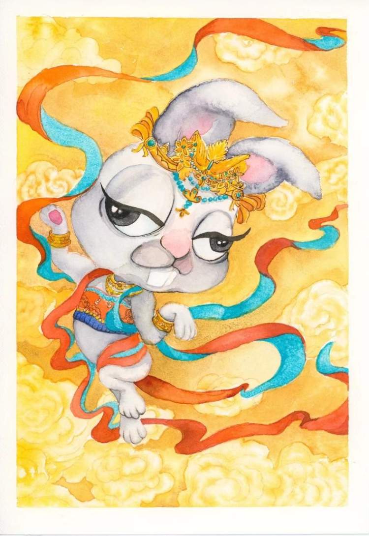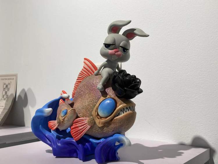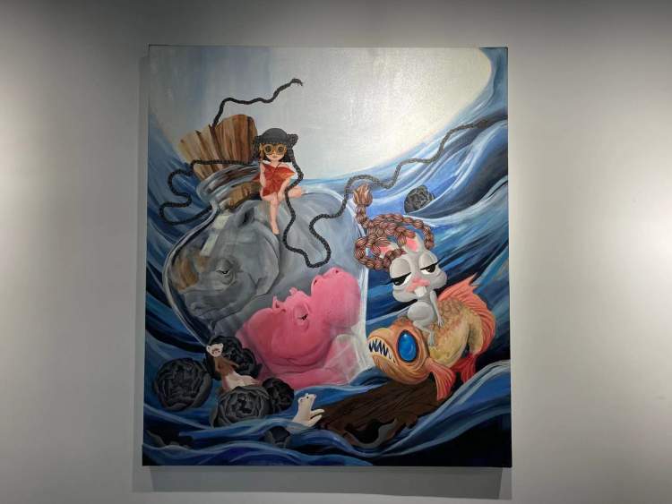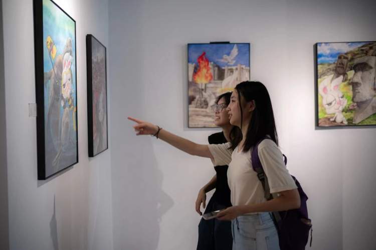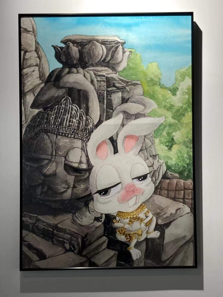 参展艺术家Joanne Q此次展出了卡通动漫风格的“兔拽拽”系列作品, Joanne Q是北京市书法家协会会员,其独特的“融合国画”画风介于水彩与丙烯作品之间。作者希望通过兔拽拽系列作品让大家饱览世界风光,寻找有趣灵魂,在畅游胜地的同时,了解当地文化,认识自己在不同文化下的别样状态,拽对人生,寻找自我。