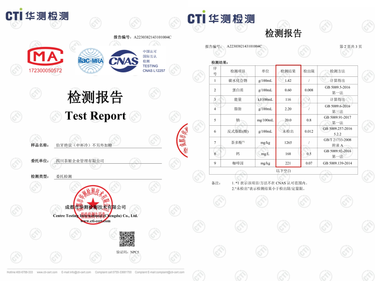 以“一杯更健康的好茶”为起点,霸王茶姬研发团队持续追踪从原产地到制作环节的每一种健康可能。针对大众最关心的热量等问题,霸王茶姬联合国家认可的第三方检验检测机构“CTI华测检测”开展专项测验,最终测定出了权威、可信的热量和营养成分信息。