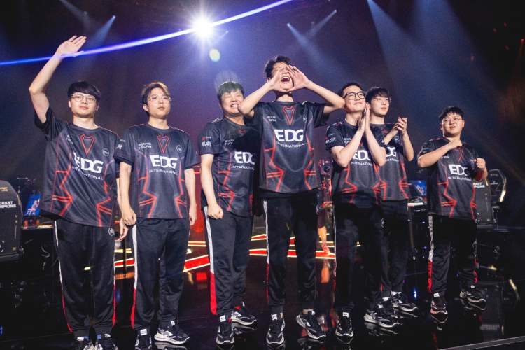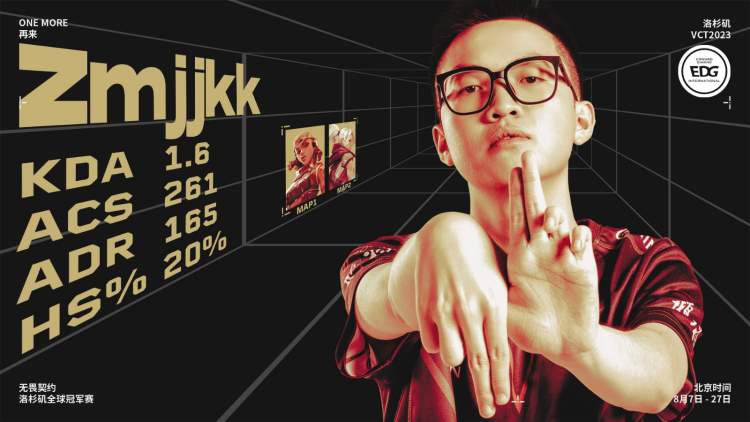 第一场图二手枪局GIA控球后选择进攻A区,遇到四人重防的EDG,五人各有击杀拿下手枪局。第五局,GIA进攻A区,ZmjjKK绕后利用终极技能完成一换二,配合队友拿下一分成功打停GIA。随即EDG连续得分,上半场比分来到8–4。下半场第一分由EDG顺利拿下,并且在第十九局中EDG成功拿到赛点。最终,nobody一波单防的三杀成功帮助队伍获取了胜利,图二双方队伍的比分定格在13-7,而两支队伍的大比分最终定格在2-0,EDG成功晋级此次全球冠军赛八强。此外,EDG的ZmjjKK选手凭借出色表现斩获本场MVP。