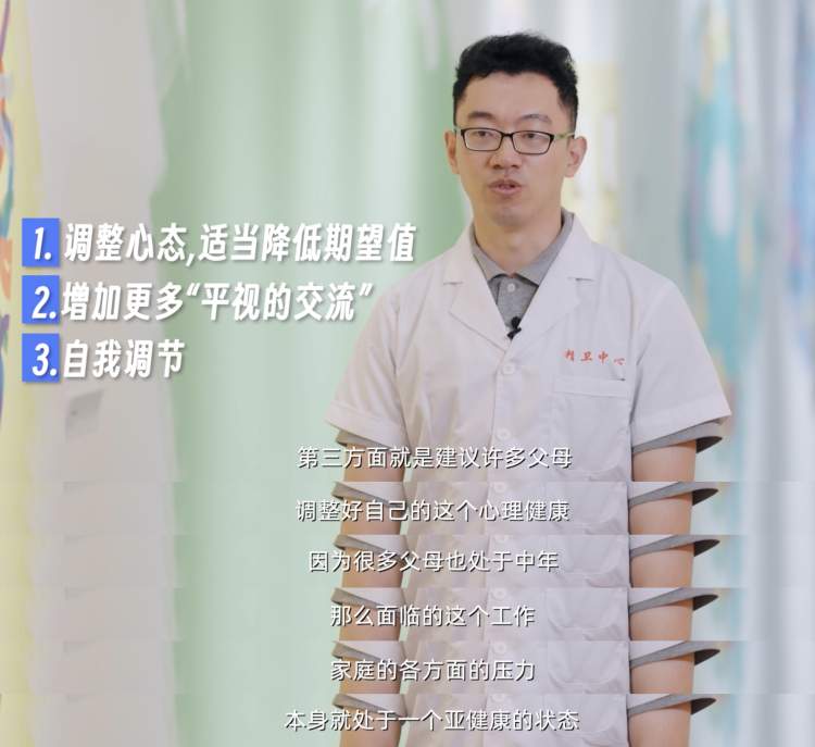上海市精神卫生中心陈智民医生也从专业的角度,给家长们提出三大方面的建议:首先是建议调整心态,适当降低自己的期待值;其次是建议要增加和孩子有更多“平视的交流”;最后是建议处在中年、本身就面临多方压力的家长,能自己调节好心理健康。
