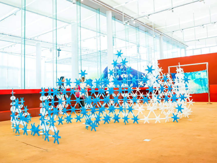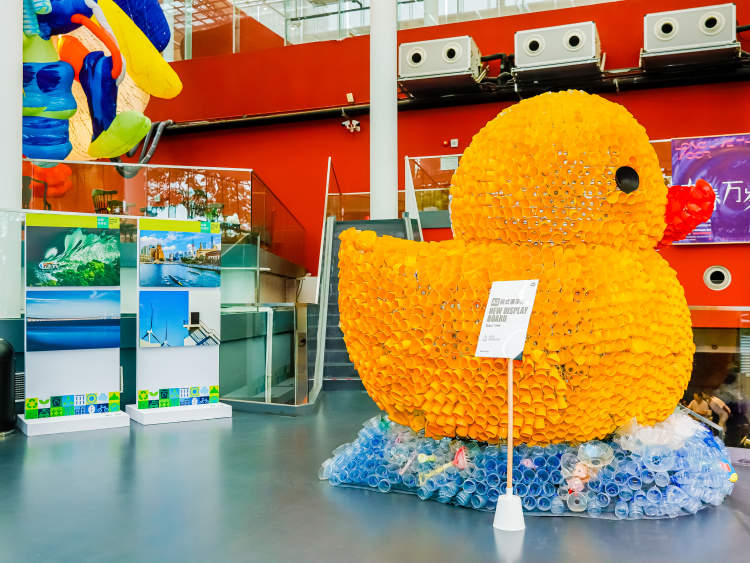 与叶青一样,此次参展的环保艺术家们还带来了很多让废料“焕然一新”的作品。刚走进展厅的时候,记者就被一只一半白色一半黄色的“大黄鸭”吸引住了,它来自于艺术家袁隆,是由回收的塑料瓶、回收的塑料玩具和钢组合而成。这件作品用大众熟知的“小黄鸭”形象,吸引和呼吁公众关注环保问题。据了解,这件作品中的塑料瓶回收自4000多个上海本土家庭。艺术家希望通过作品向更多的家庭传递出环保理念,尤其是让日常生活中的“亲密伙伴”不再是环境的负担。此次,袁隆还带来了两件装置作品,也在展厅的三楼,分别是用rPET材料,经过3D打印技术生成的“可持续共鸣体”和营造园林氛围,呈现水循环系统的作品——亭Ⅱ。其中,记者被“可持续共鸣体”作品上出现的一个个芯片造型吸引了,据介绍,观展者可以用手机靠近“芯片”,就可以链接到一个“声音库”,能够听到他们收集到的,来自世界各地、不同的人对环境保护的“呼吁之声”。在现场的展示板上,还有一个声音收集的二维码,观展者可以扫码,选择一个环保问题,并录制自己的回答,声音将上传至声音库,并有机会被更多的人听到。