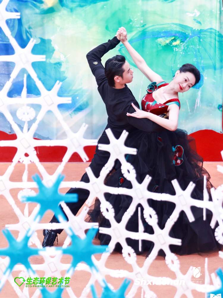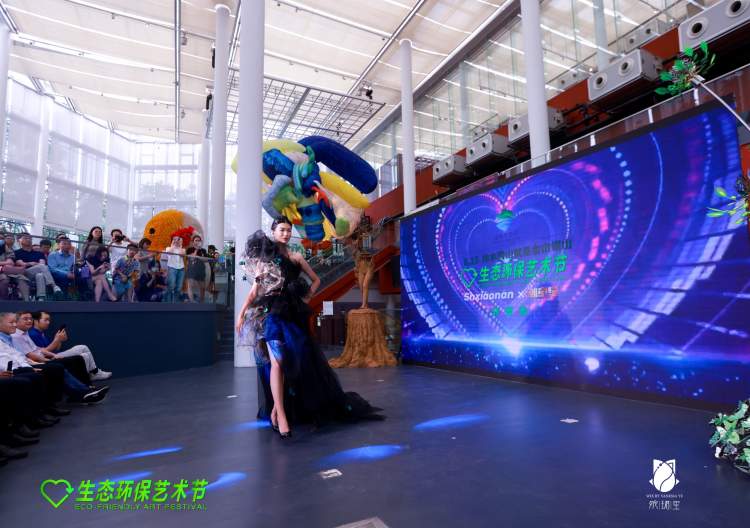 开幕式上,多种艺术风格进行了展示。本次环保艺术节的总策划、总导演王力与诗人古冈联袂朗诵了《人与自然和谐共生》;马晓辉带来了二胡曲《万马奔腾》,诠释出人与自然的关系,以及生物之灵……当一群小朋友迈着自信的步伐,走上舞台,一下子吸引了现场观众的目光,这群来自潮童星的孩子们和超模刘星岐一同带来了一场生态环保服装秀。值得一提的是,刘星岐身穿的这件高定礼服全部是用废布料拼接制作而成,小孩子们的衣服上也点缀有废布料制成的设计元素,其中一些还融入了海派非遗的钩针设计。据悉,这些作品来自于受邀参展的环保艺术家叶青,她也是WJX婉珺玺高级定制服饰品牌创始人、上海小囡Shxiăonán IP的缔造者。此次叶青还邀请了PACC驻地传承人海派钩针编结传承人林花和造型艺术家肖岚,携手共创了一件《青山绿水》手工装置作品,呈现在展馆三楼的展示区,作品用非遗编结工艺结合当代艺术表现形式,描绘出一幅河流从山间流下,穿过丛林、花草,最终汇入大海的画面,以此呼吁人们保护美丽的天地山河。