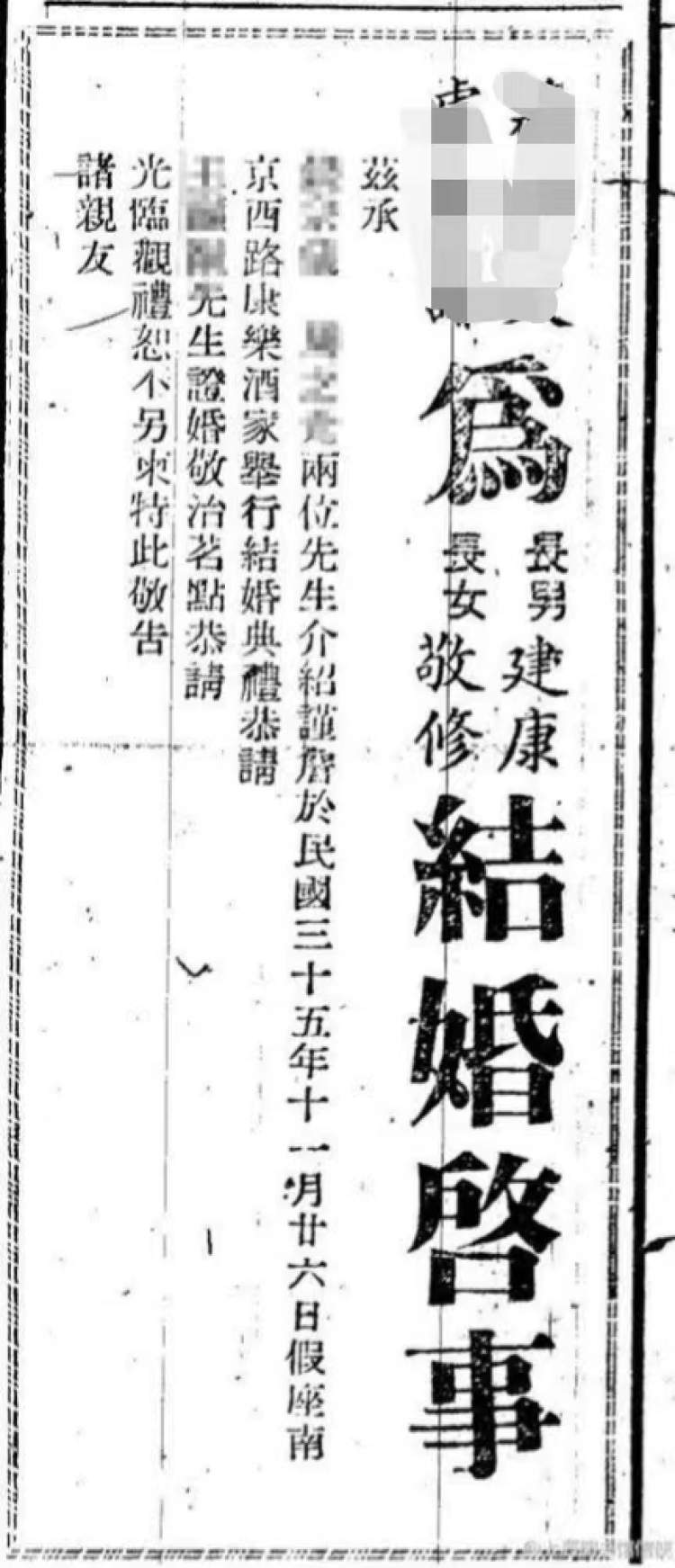 在民国时期,《大公报》《申报》等报纸都刊登过许多结婚启事,郁达夫和王映霞、瞿秋白和杨之华、徐志摩和陆小曼等名人都曾因婚姻相关事宜进行登报。这些都证明,在民国时期,“结婚登报、敬告亲友”是很多家庭都会选择的一种方式。
