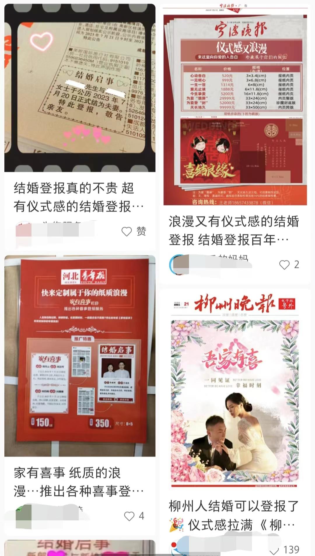 随着希望喜讯登报的读者不断增加,许多媒体趁热推出了专门的结婚登报服务,这一摩登与复古交融的方式逐渐成为官宣新潮流。