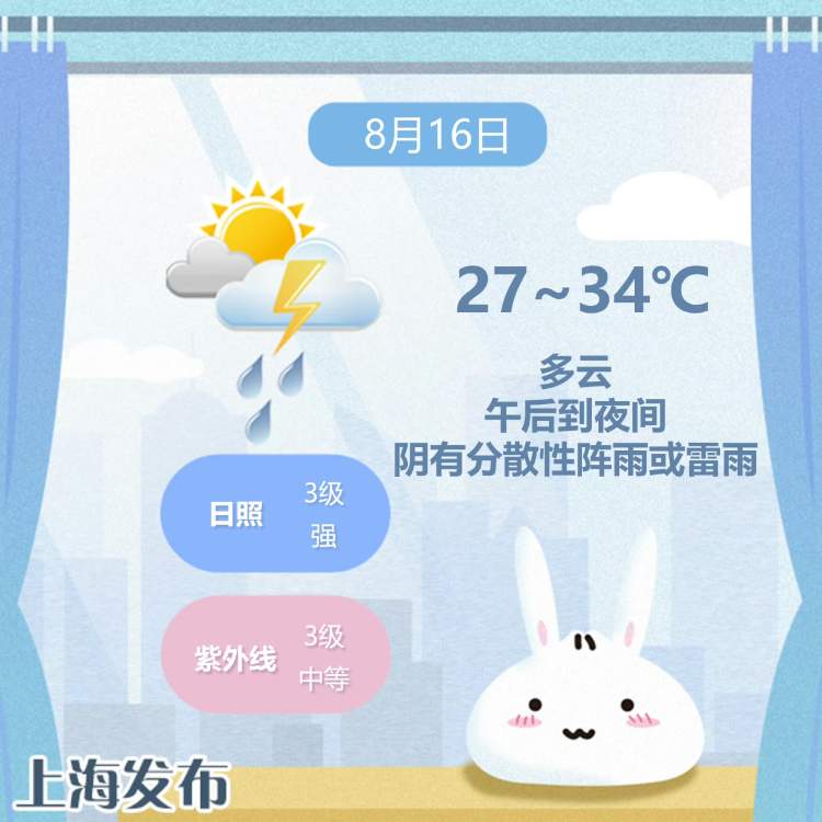 申城天气:热热热!今天最高气温34℃,明日降雨降温 周到君 2023-8-16 来源:周到上海 上海今天多云,午后到夜间阴有分散性阵雨或雷雨,出行记得带上雨伞哦~午间时段热力升级,全天气温在27-34℃,偏东风3-4级,相对湿度90%-55%,体感热而不闷。 明天开始会有一次降温降雨的天气过程,相对凉爽,一起期待吧~ (内容综合自上海发布、@上海市天气) 来源:周到上海 作者:周到君 赞一个 (0)