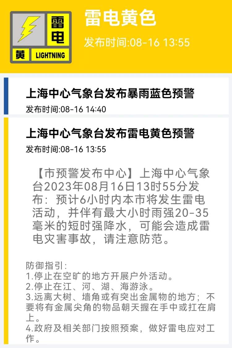 上海中心气象台8月16日13时55分发布雷电黄色预警信号:
