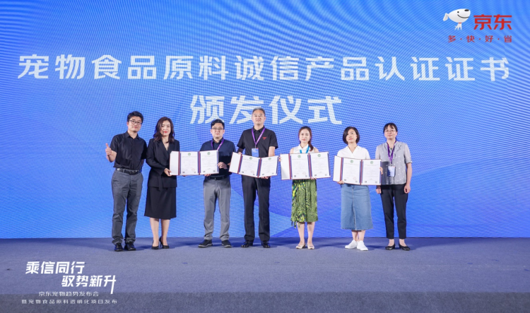 在原料诚信认证方面,京东超市联合第三方认证机构北京华思联认证中心,打造行业首个“宠物食品原料诚信产品”认证标准,并对符合原料安全、用料真实、配方诚信、监督负责的宠物食品产品,授予原料诚信产品认证证书。