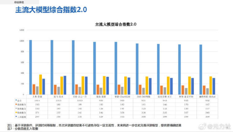 排名由高到低分别是讯飞星火、百度文心一言、商汤商量、智谱 ChatGLM、360 智脑、昆仑万维天工、阿里通义千问、澜舟 Mchat。根据基础能力、智商能力、情商能力、工具提取四个维度计算总分。