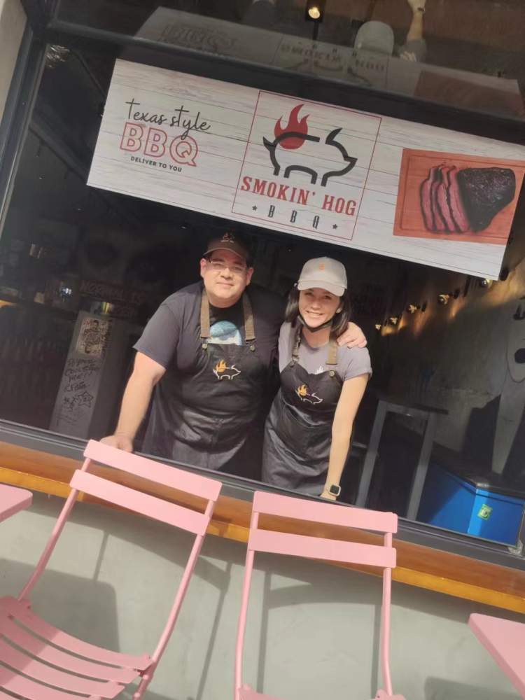 静态管理一解除,他们立刻全速完成厨房准备工作,此外是雇人和培训。Smokin'Hog是去年7月19日正式启动的。这只是一个小小的外卖厨房,连他们在内只有六个人。