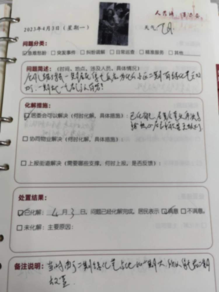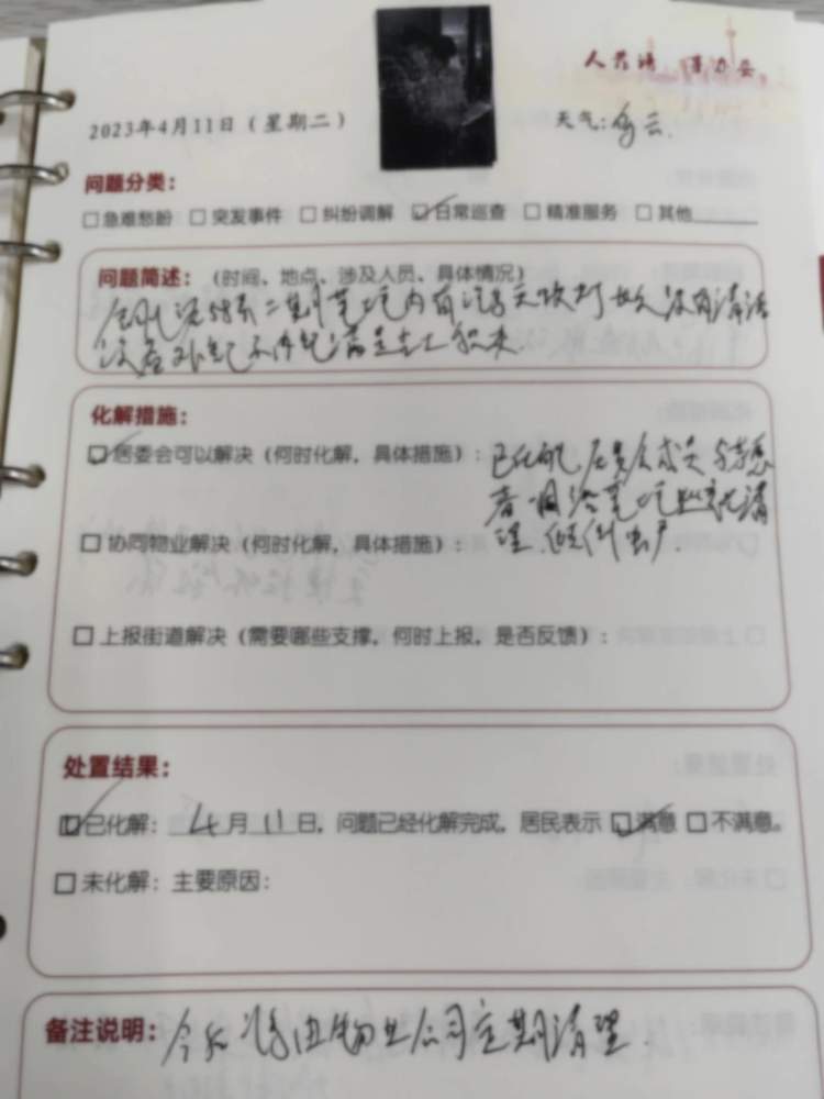作为太浜巷居民区环境的“守护人”,杜德龙一直坚持“一日两巡”的工作方法,将整治环境延伸到社区的角角落落。现在,每天小区巡逻的时候,杜德龙也习惯随身带着一支笔、一本本子,随手记录居民所反映的各类问题,确保能及时跟踪处置,做到“事事有回应,件件能闭环”,并从中发现忽略的小细节。通过连续不断地走访劝说和坚持不懈地做好群众工作,及时化解了居民反映的建筑垃圾堆放点设置不合理、小区环境卫生死角频现、楼道乱堆物挤占公共空间等诉求问题,一点一点改变着小区的环境面貌,这些点滴小事的累积,不仅赢得了居民的信任,拉近了与居民的距离,也触动了居民参与社区环境治理的积极性、主动性,让营造舒适、整洁的小区环境变成了大家一起努力的事。
