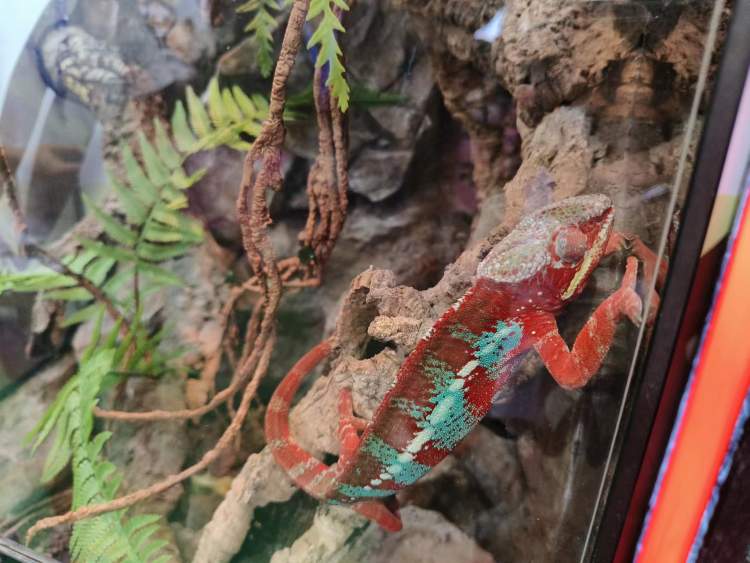 一只七彩变色龙正在扒拉玻璃柜,吸引了众多观众围观。变色龙善于“伪装”,随着环境变化颜色,隐藏自己、捕捉猎物,还可调节体温。它的每只眼睛都可独立转动和聚焦,拥有几近360度的全方位视野。