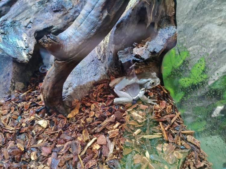 蜡白猴树蛙正在静静观察,其耳后以及背部的腺体会分泌出特别的脂类物质,通过给自己身体“抹蜡”的方式可减少通过皮肤的水分的流失,背上颜色还会根据所处的环境变化而变化。