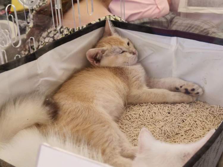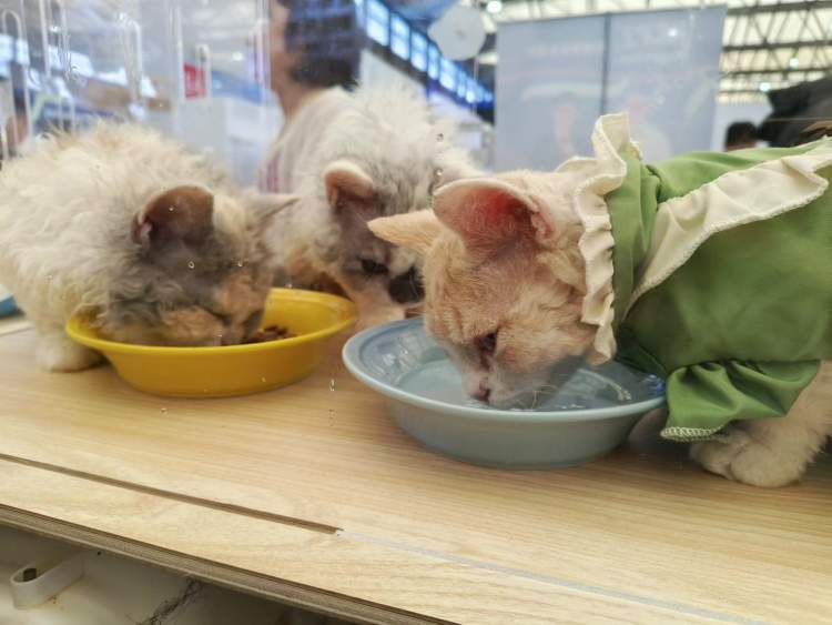 不过比赛场地不大,观众无法进入比赛区域近距离观看。想要逗猫的小伙伴不要错过外围的“美喵”展示柜,有正在吃饭喝水的猫猫,也有正在打瞌睡的,还有跟着逗猫棒挥舞着小爪子的。