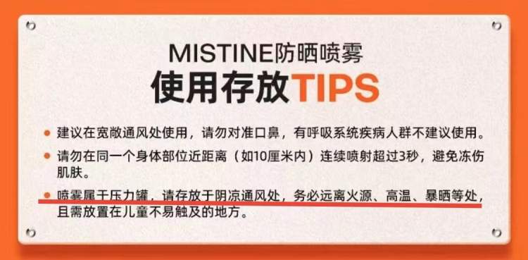 蜜丝婷海外旗舰店的防晒喷雾页面,也有“务必远离火源、高温、暴晒”的提示。