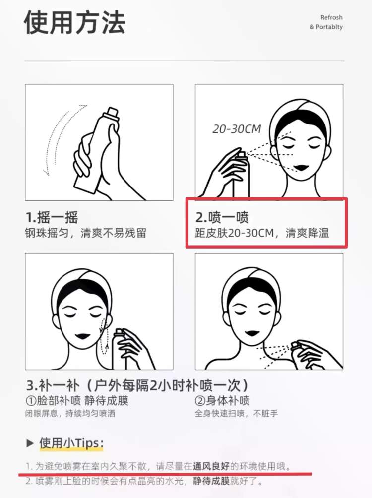 玥之秘水晶防晒喷雾在使用方法中写出,喷洒时距离皮肤20-30厘米,避免喷雾在室内久聚不散,请尽量在通风良好环境中使用。