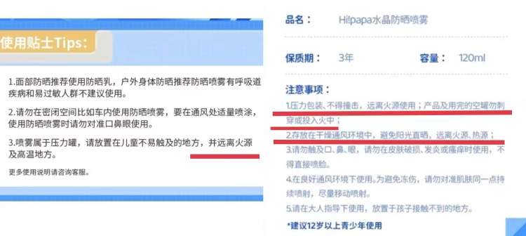 Hi!PaPa水晶防晒喷雾在商品展示页面的安全警示中写道:喷雾属于压力罐,请放置在儿童不易触及的地方,并远离火源及高温地方。