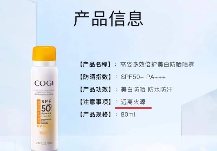 高姿多效倍护美白防晒喷雾也在注意事项中写出“远离火源”。