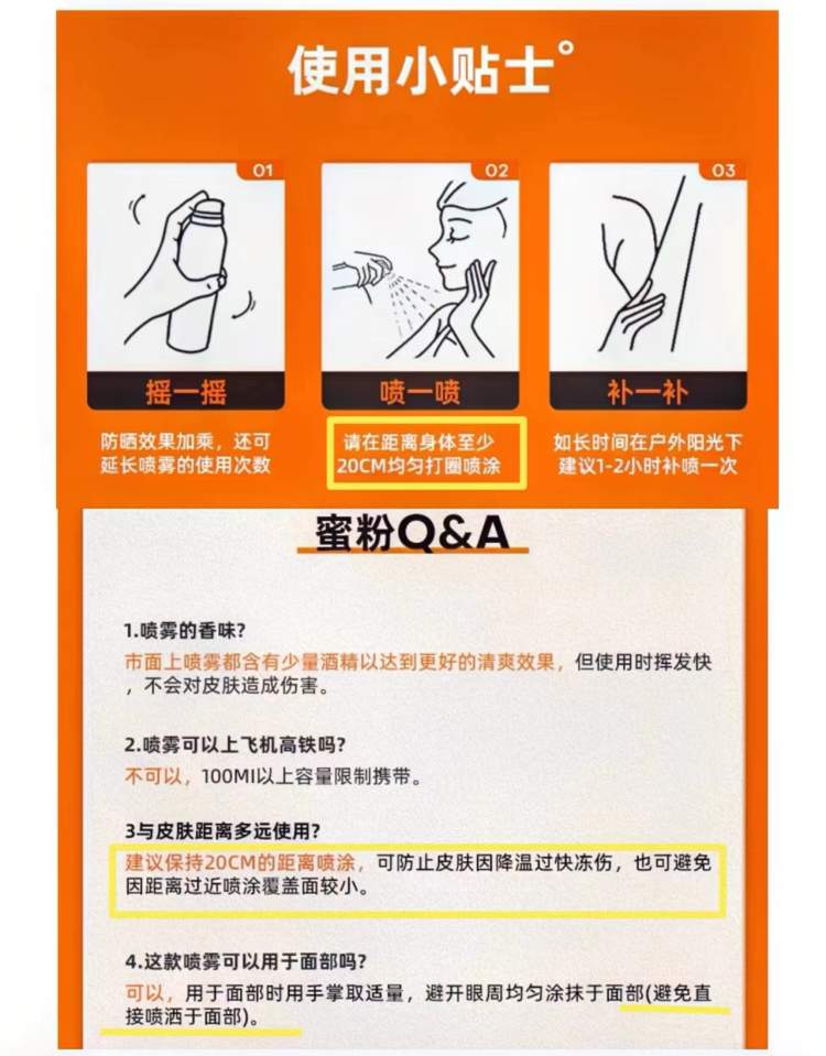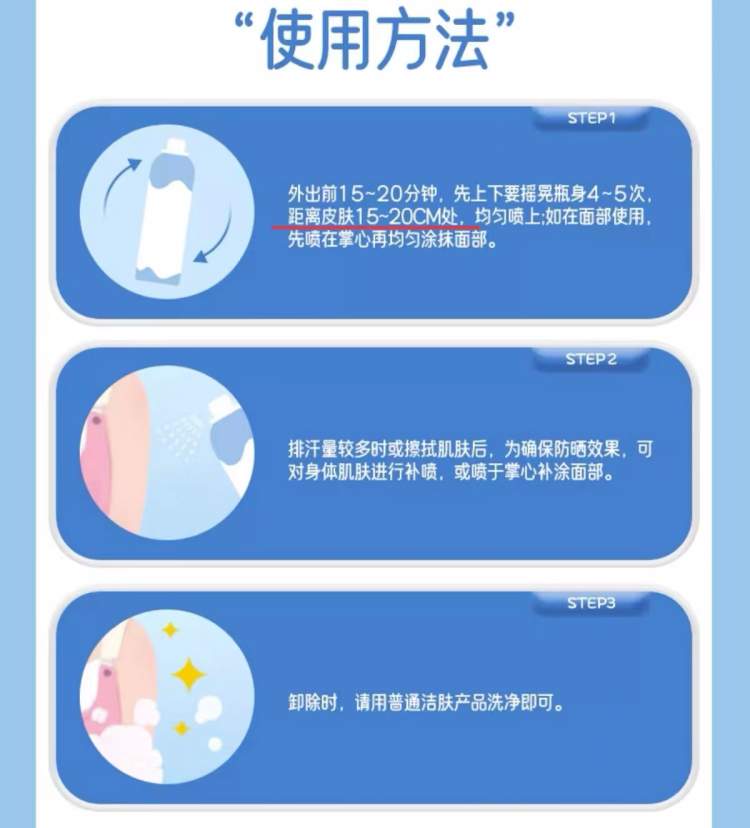 蜜丝婷水活清透倍护防晒喷雾表示,建议保持20cm的距离喷涂,可防止皮肤冻伤和覆盖不足的问题。用于面部时,用手掌取适量,避开眼周均匀涂抹于面部,避免直接喷洒在面部。
