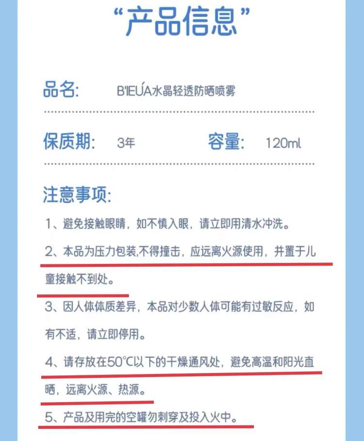 而在BIEUA水晶轻透防晒喷雾的五条注意事项中,有三条和“火”相关:本品为压力包装,不得撞击,应远离火源使用,并置于儿童接触不到处;请存放在50℃以下的干燥通风处,避免高温和阳光直晒,远离火源、热源;产品及用完的空罐勿刺穿及投入火中。