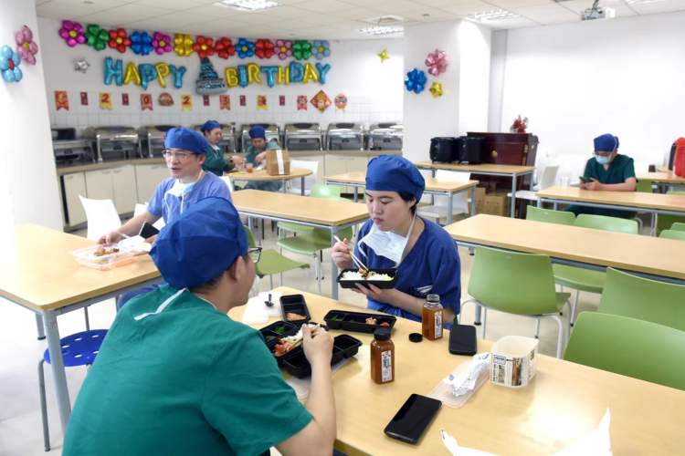 继续往里走是用餐区,原本陈旧的设备和桌椅焕然一新,冰箱内放着矿泉水和饭盒,柜台上放着两个微波炉。吃完饭后,职工们还可以到最里面的休息室,躺在躺椅上休息片刻,休息室内准备了耳塞、毛毯等物品。