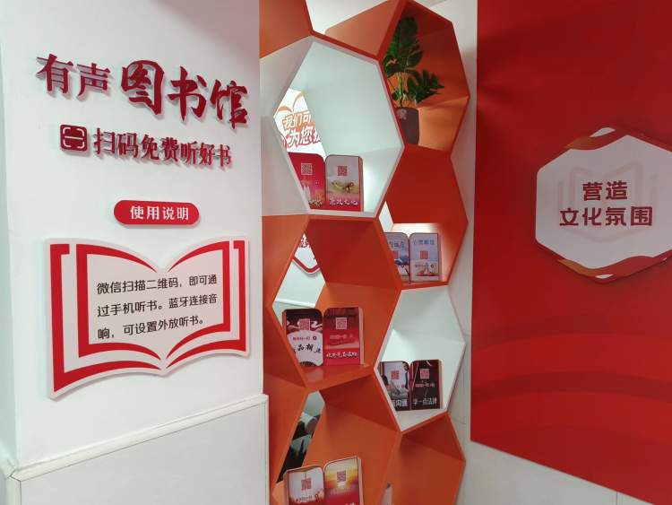 该职工工间休息室的入口处,放着供紧急情况下使用的自动体外除颤器。进入后,一侧是“有声图书馆”,微信扫描二维码,即可通过手机听书;另一侧摆放着一排书架,上面放着内容丰富的书籍。