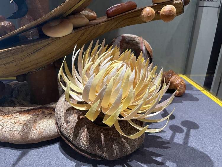 这里龚鑫特别分享了一个案例,“以前一位欧洲的老师教我们说,做创意造型不能做倒三角形的,一个点支撑不住。但你看我这个(音乐熊猫)就是倒三角形的,一个点支撑了那么多。我还做过一个作品,直接就是60度倾斜的,因为大家都觉得竖直的才能立得住。还是这个音乐熊猫,做出来大家都比较惊讶,觉得面包不可能做到那么精细。尤其这些云,我们也请专家来讨论,他们建议我们把云做成厚一点、坚固一点的,但我们没有采纳,还是走了凸显手工艺的。确实很脆,运送、安装都要很小心,稍稍用力就碎了。”