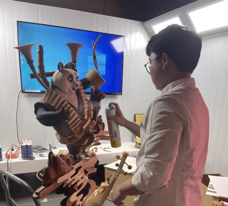 中国特色的琵琶、唢呐,鼓奏出飘飘仙乐,让人产生联想,脑中浮现出一幅美好的画面:一只熊猫站在山顶上唱歌,脚下祥云环绕,山峰都仿佛漂浮在空中,整个画面满满中国风的写意和灵动。“当时我们这个作品出来,评委和其他同行看到都比较喜欢,因为熊猫真的在国际上非常受欢迎、又珍贵又憨态可掬,同时它也非常能代表中国。”