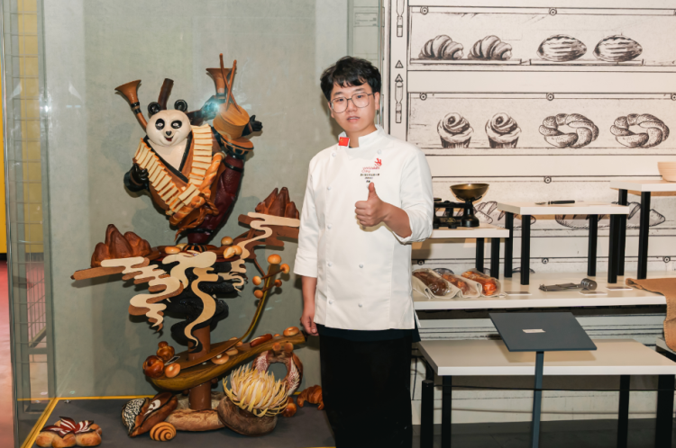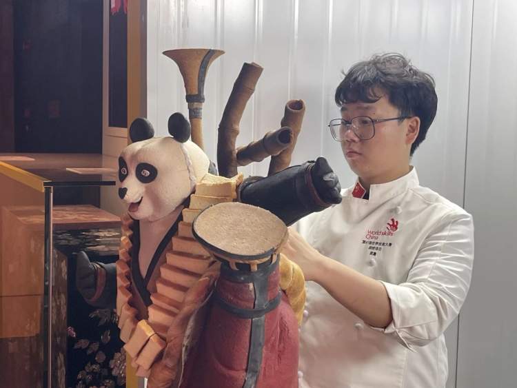 盛夏的下午,在世界技能博物馆忙碌了近三个小时后95后面包师龚鑫复刻完成了自己2020全球烘焙世界杯的冠军作品“和平大使——音乐熊猫”。